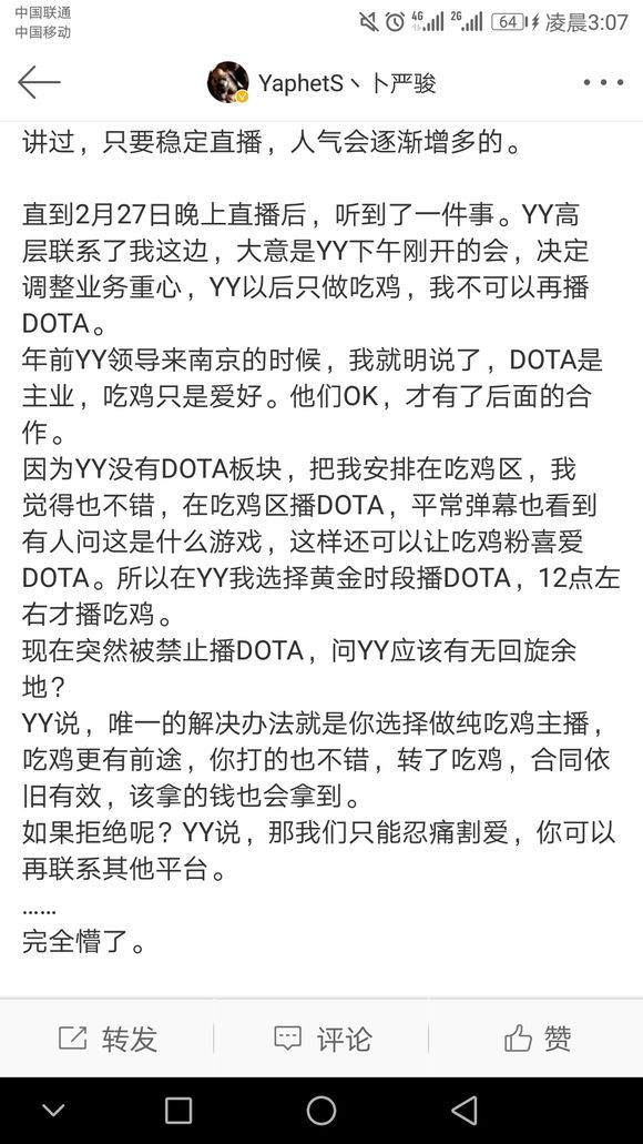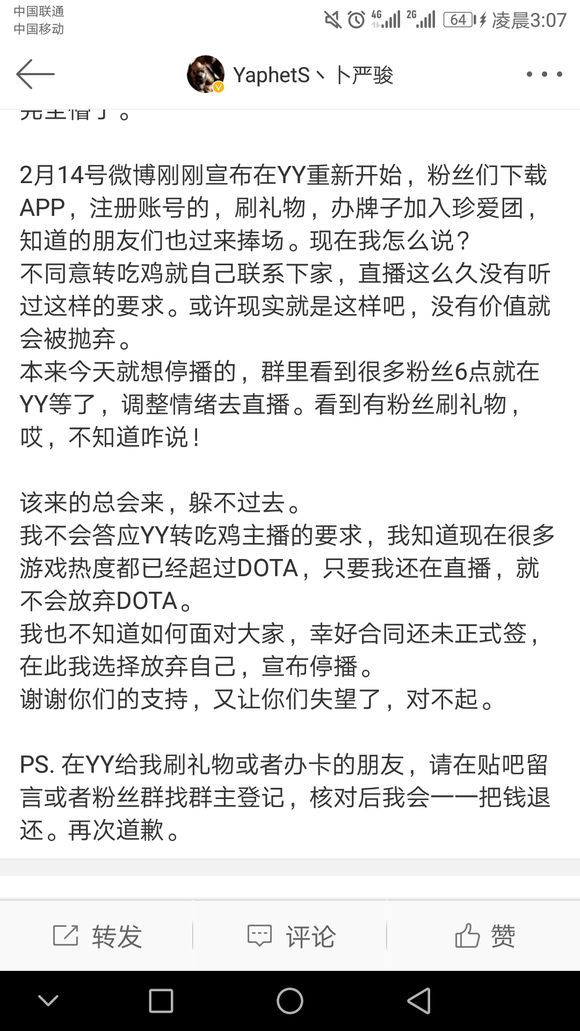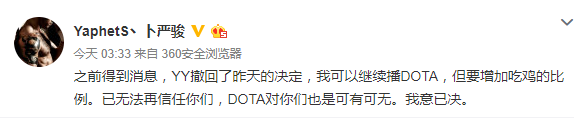 后来,事情稍有转机,Pis得到消息,YY撤回了昨天的决定,自己可以继续播Dota,但要增加吃鸡的比例。然而Pis表示已无法再信任YY,Dota对你们也是可有可无。我意已决。
