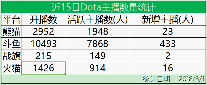 因为部分平台没有单独的Dota分区,我们选取了几个比较有代表性的游戏直播平台:斗鱼,熊猫、战旗、火猫,统计其最近15天Dota主播数据情况做了一个统计: