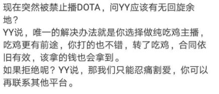 然而在2月27日,Pis直播结束之后就收到通知禁止播Dota。突然间就被禁止直播Dota,Pis在问YY有无回旋余地?YY回应,唯一的解决办法就是:你选择做纯吃鸡主播,吃鸡更有前途。如果拒绝呢?YY说,那我们只能忍痛割爱,你可以再联系其他平台。