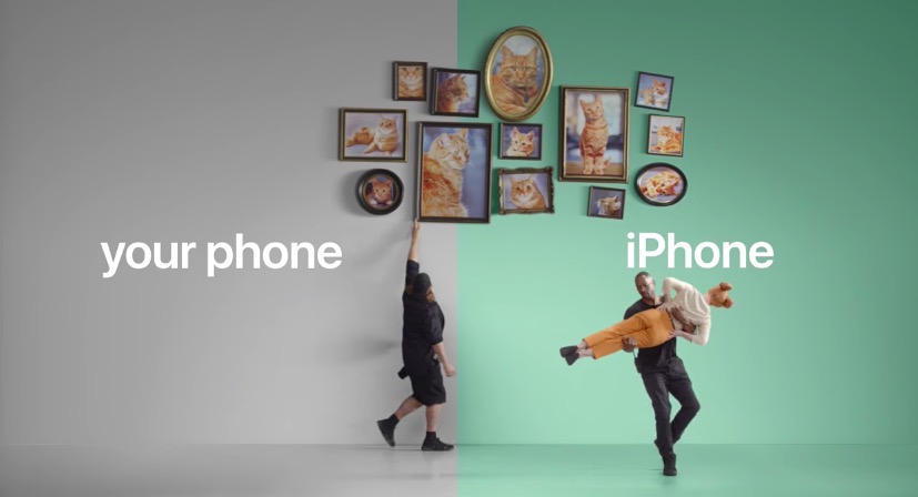 为了吸引更多“其他手机”用户使用iPhone,去年5月,苹果就推出过同样风格的几条广告:一个女孩站在原本的灰色区域内对着乱糟糟的墙壁照片苦恼,一个壮汉走进画框,把她搬进“iPhone”的绿色区域,照片立刻变得整整齐齐,暗喻苹果的照片整理系统优于其他。