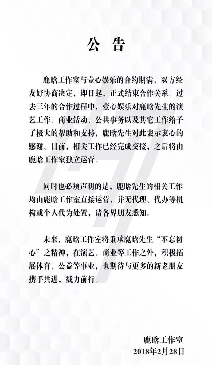2月28日上午9点57分,鹿晗工作室发布了一纸公告,宣告鹿晗工作室与壹心娱乐合约期满,双方和平解约,之后鹿晗的工作将直接由工作室运营。