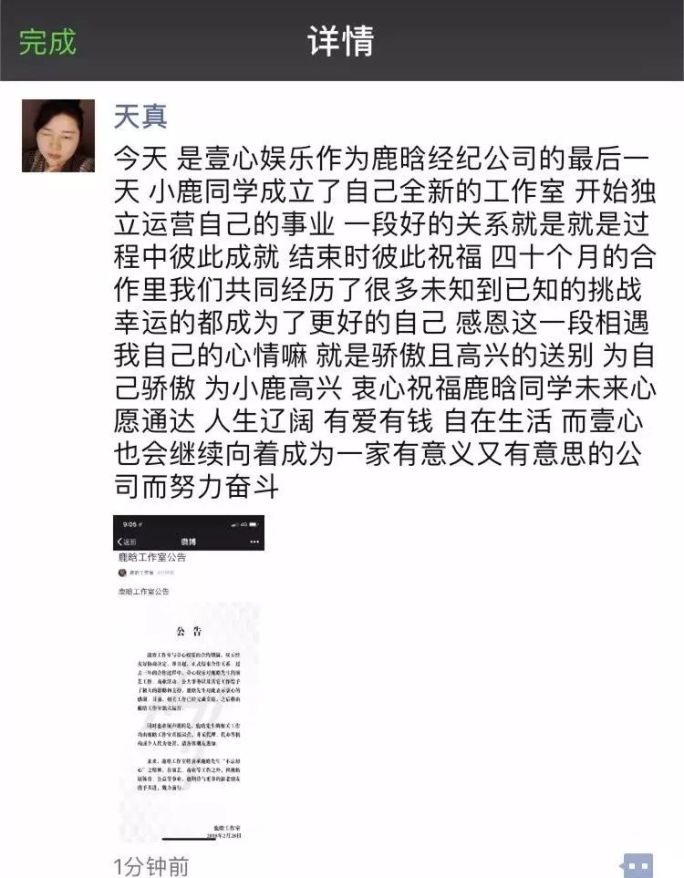 很快,鹿晗的经纪人,现在已经可以称之为前经纪人的杨思维(杨天真)在朋友圈发文祝福:“衷心祝福鹿晗同学未来心愿通达,人生辽阔。”