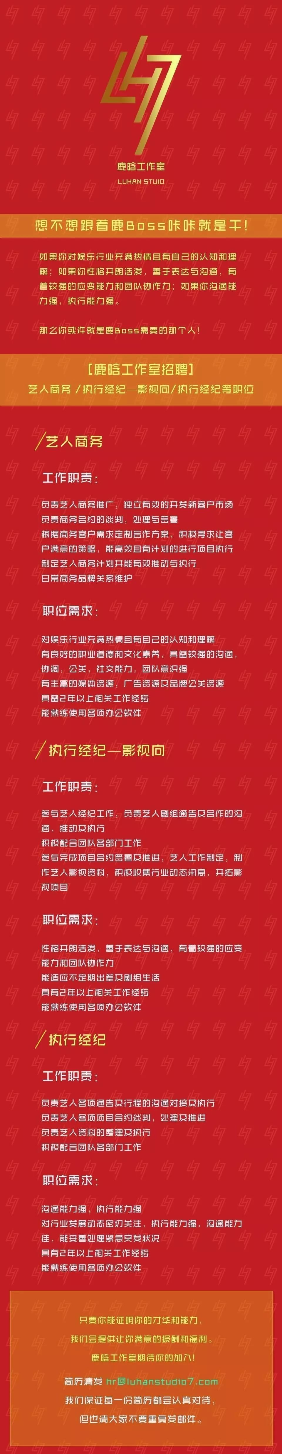 这则长长的招聘启示中其实只写了三个岗位:艺人商务、执行经纪(影视向)和执行经纪。离开了手腕强硬的经纪人,鹿晗手上最缺的可能就是优秀的商务和执行经纪。