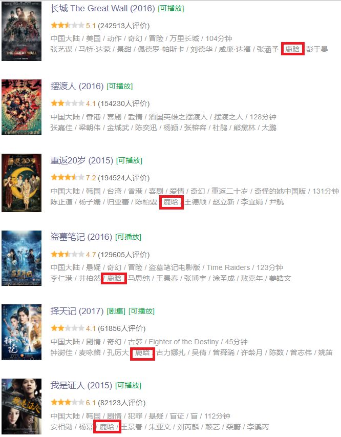 豆瓣评分显示,鹿晗参演的影视剧评分大多以4开头,且鹿晗在一番位的作品并不多。除了在《我是证人》中的表现较为良好,其他的作品无论在角色还是演技方面都大同小异,譬如《重返二十岁》中的音乐少年、《摆渡人》中的年轻偶像、《择天记》中的古代杰克苏……