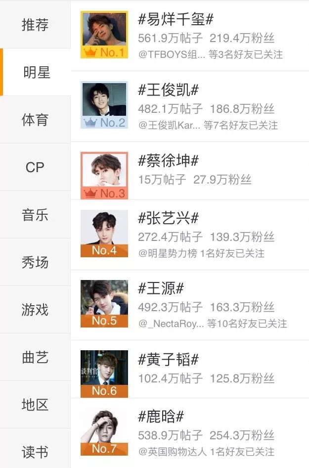 常年位居微博超级话题榜首的鹿晗,目前已掉至第七