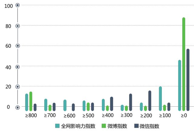 其中,全网影响力指数达到800以上的有13家,占比12% ,微博传播指数在800以上的企业有15家,占比14%,微信传播指数在800以上的企业仅有3家,占比3%;62%的企业全网影响力指数都处于在100以下。