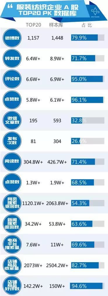 全网传播力指数排名前20的企业,在社交推广方面创造了的71%的阅读量、90%以上的点赞、评论数;品牌曝光方面贡献了60%以上搜索量;在电商表现方面,囊括了82%的商品收藏量和94%的店铺好评数。不管是媒体宣传的频率、品牌曝光还是粉丝黏度,都取得了压制性胜利。