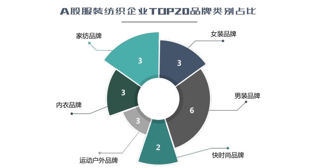 在A股上市纺织服装企业全网影响力排行榜前20名品牌中,男装品牌表现更好。快时尚品牌有2个,女装品牌有3个,男装品牌有6个,内衣品牌有3个,运动户外品牌有3个,家纺类品牌有3个。