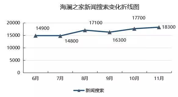 从折线图的数据观察,海澜之家的新闻搜索数在8月份达到一个小高峰,8月中旬海澜之家入股快时尚品牌URBAN REVIVO、8月底与天猫形成战略合作,这是新闻曝光增加的主要原因。9月中旬海澜之家和万达集团领导人深入洽谈、启程公益行动新闻曝光量又开始持续走高,在11月中旬达到最高值,与海澜之家“双11”荣获天猫男装品牌销售量第一刚好吻合。