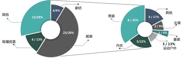 94家企业46个线上电商中,主营服装类企业有23家、家纺企业有4家、鞋履皮具企业有6家;服装企业中有男装企业8个、女装企业2个、童装企业1个、运动户外品牌3个和内衣品牌5个。
