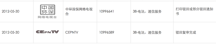 同时,界面新闻发现,中环文化传媒(北京)有限公司曾于2012年5月注册了两个商标,分别为“CEPNTV”和“中环国保网络电视台”,后者商标极易被混淆成“中国环保网络电视台”。根据国家工商局信息显示,两份商标申请均被驳回。