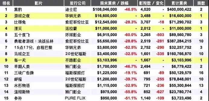 根据comScore的数据统计,得益于《黑豹》的票房表现,2018年迄今为止的北美票房营收较2017年同期增长了12.5%,而在两周前《黑豹》尚未上映时,北美票房曾落后2017年同期1%以上。