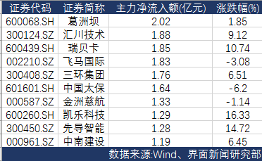 本周连续五个交易日实现主力净流入,且累计净流入额超过1亿元的个股仅有13只。其中,葛洲坝(600068.SH)、汇川技术(300124.SZ)、瑞贝卡(600439.SH)主力净流入额居前,分别为2.02亿元、1.88亿元、1.85亿元。