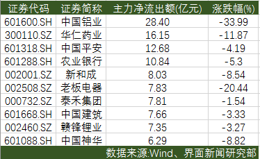 在本周连续五个交易日遭遇主力净流出的个股中,累计净流出额超过1亿元的个股共计61只。这其中,17只个股累计净流出额超过5亿元,而中国铝业(601600.SH)、华仁药业(300110.SZ)、中国平安(601318.SH)、农业银行(601288.SH)资金累计净流出额超过10亿元,分别为28.40亿元、16.15亿元、12.68亿元、10.84亿元。
