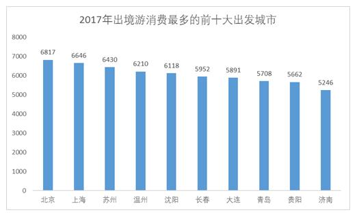 携程报告显示,2017年人均花费最高的十大城市为:北京、上海、苏州、温州、沈阳、长春、大连、青岛、贵阳、济南。其中,北京以人均6817元位居第一,其次是上海、苏州、温州。