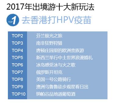 报告显示,中国人旅游已进入“个性化时代”。报告列出“2017年出境游十大新玩法”包括:去香港打HPV疫苗、芬兰赏极光、美国1号公路骑行、非洲狩猎、新西兰举行中土世界婚礼、唐顿庄园体验欧洲贵族生活等。