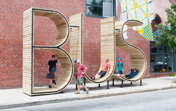 在美国巴尔的摩的社区内有一个非常显眼的公交站,这个公交站由西班牙艺术家团体mmmm...所设计,高14英尺,由三个巨型英文字母“BUS”组成。除了中间的字母“U”以外,这个公交站还是可以遮阳挡雨的。你可以在每个字母都换种方式躺着或站着,等都尝遍,公交说不定早就走了。