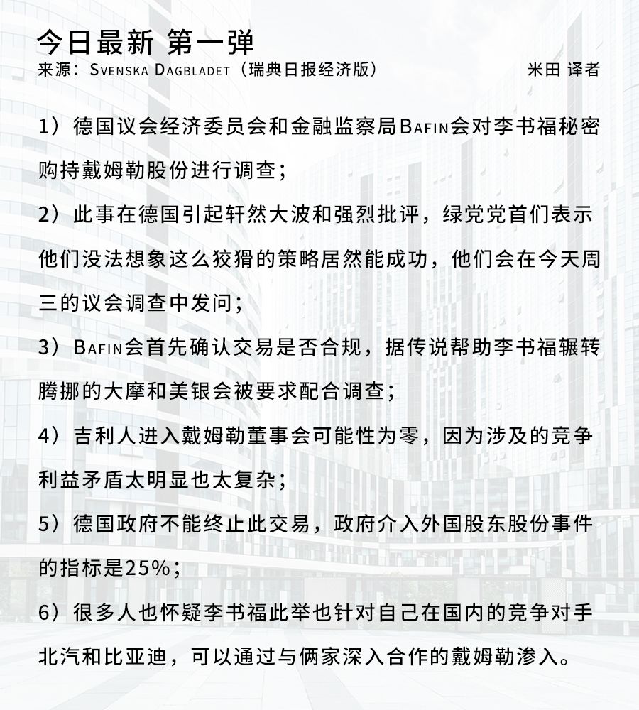 3)有关渠道消息戴姆勒也不会让吉利团队进入董事会;