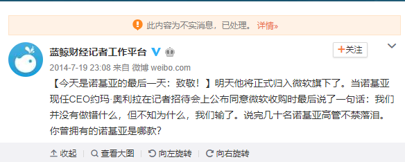 2013年9月,微软宣布以约54亿欧元的价格收购诺基亚设备与服务部门(诺基亚手机业务),在这期间,曾流传着一个故事:在诺基亚被微软收购的记者招待会上,其CEO约玛·奥利拉在演讲的最后稍作停顿,然后说了一句:“我们并没有做错什么,但不知为什么,我们输了。”说完,在场的几十位诺基亚高管潸然泪下。