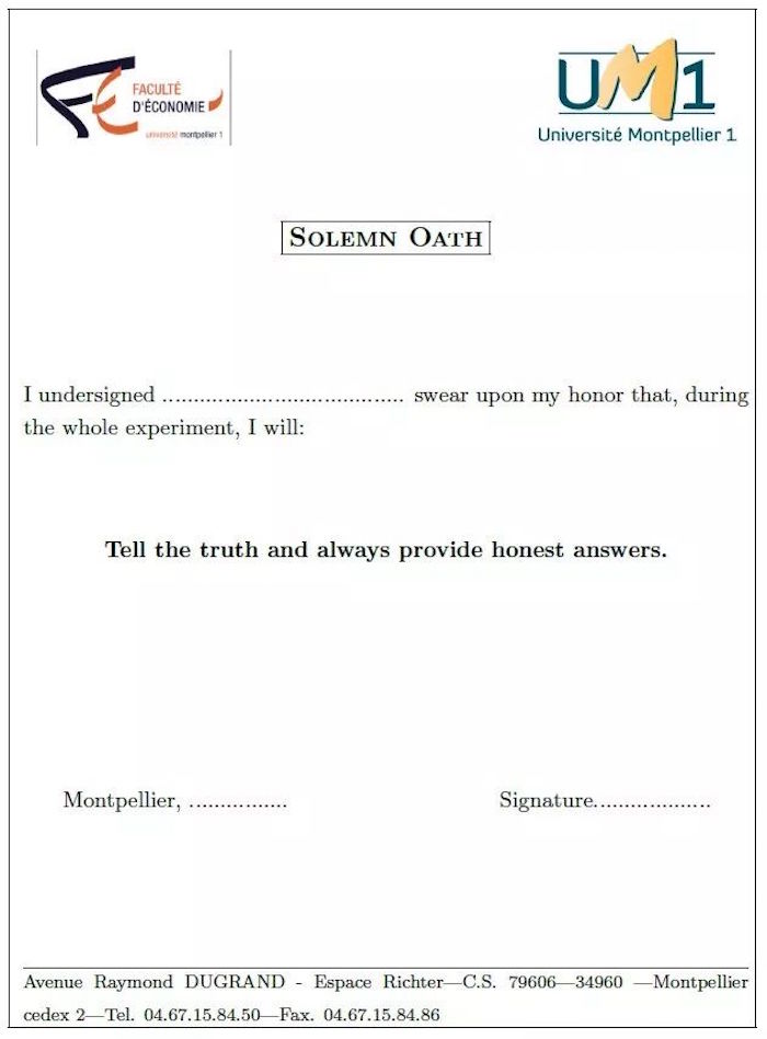 近期,巴黎第一大学经济学院的Nicolas Jacquemet及其合作者马赛大学管理学院的Luchini等人,设计了一套新的行为经济学实验,试图弄清楚宣誓对人的行为有何具体的影响,尤其是对人们的不诚信行为会产生怎样的影响。