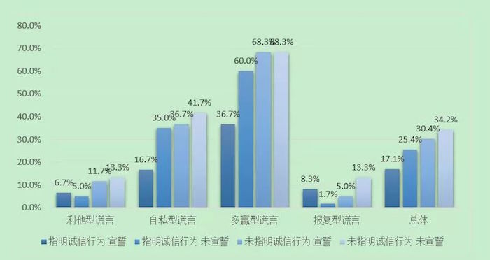 脱离具体内容的誓言,效果又如何呢?总体来看,没有具体内容的誓言,宣誓的效果不佳,说谎者的数量仅比未宣誓人群低3.8个百分点,且统计结果并不显著。具体到对谎言类型的影响,我们发现无具体内容的誓言,无论是否宣誓,多赢型谎言和自私型谎言的比重最高。这表明在脱离具体情景下,社会暗示的作用减弱,人们更多的从经济收益的角度出发,甚至愿意为之冒险。