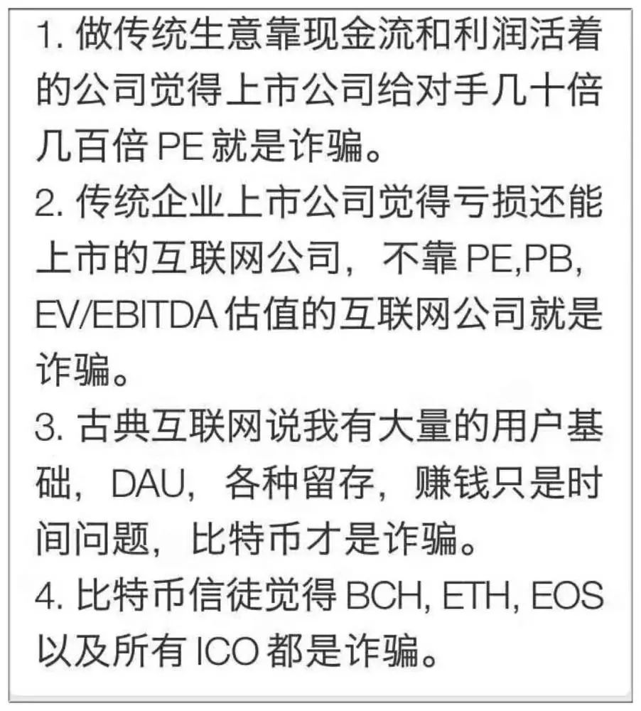 他还列出了“骗子”的鄙视链:传统生意者觉得上市公司是骗子,上市公司觉得互联网不盈利是骗子,互联网又觉得区块链没有落地没有用户是诈骗。