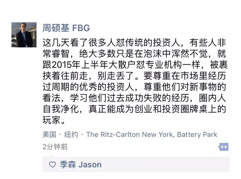 比特币对冲基金FBG Capital合伙人周硕基也表示:“要尊重市场里经历过周期的优秀的投资人,尊重他们对新事物的看法,学习他们过去成功失败的经历,圈内人自我净化,真正成为创业和投资圈牌桌上的玩家。”