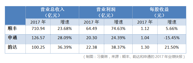 除了百世,目前还有顺丰、申通和韵达发布了2017年业绩快报,三家快递公司业务数据如下: