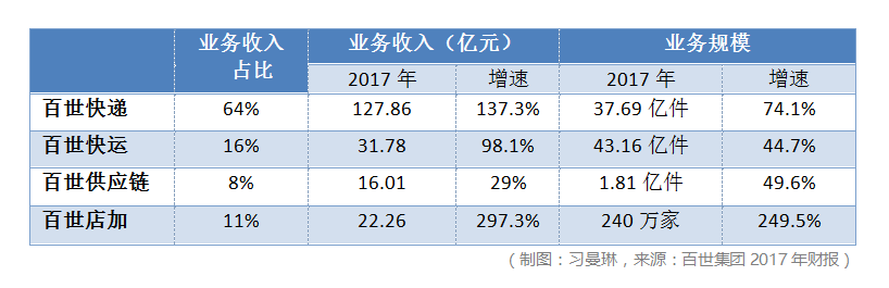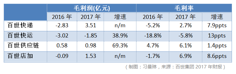 百世扭亏为盈,2017年其各个板块具体表现如下: