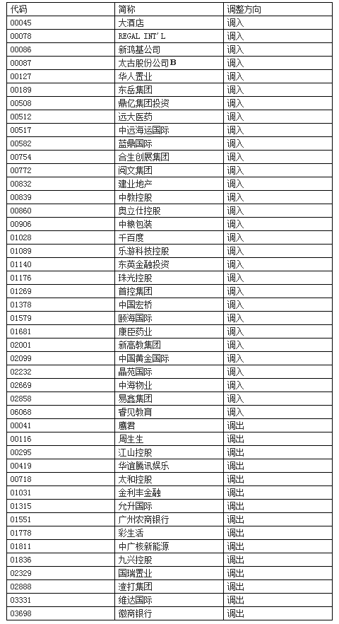深交所今日早间发布公告,因恒生综合大型股指数、中型股指数、小型股指数实施成份股定期调整,根据《深圳证券交易所深港通业务实施办法》的有关规定,港股通股票名单发生调整并自今日起生效,其中调入大酒店、新鸿基公司、东英金融、中粮包装等30股,调出鹰君、徽商银行、渣打集团等15股。