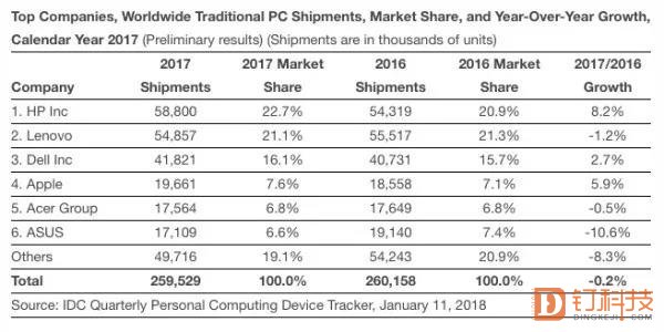 可以看到,在整个2017年中,惠普的全年出货量仍然排名第一,市场占有率为22.7%。联想排名则是第二,市场占有率为21.1%。第三名为戴尔,市场份额为15.2%。第四名则是由上年的华硕变成了苹果,苹果在去年出货近2000万台,市场份额为7.6%,同比增长了5.9%,而华硕下滑到了第五名。再加上宏碁,这六个厂商占据了PC市场80%左右的份额,留给其他企业的空间并不大。
