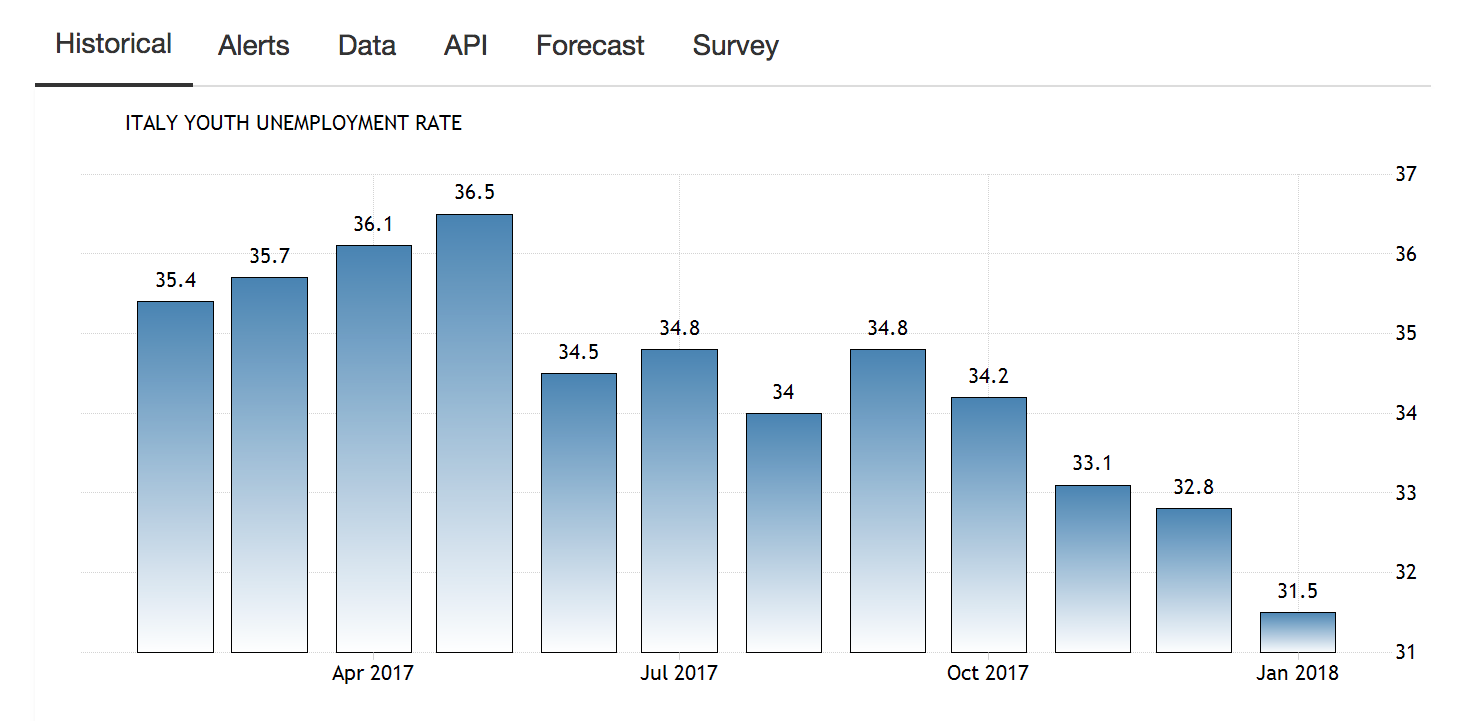 经济疲软的另一面是失业率居高不下,首当其冲的是年轻劳动者。截至2017年底,有三分之一的年轻人没有工作,这是欧盟平均水平的两倍之高。短期合同和兼职合同的数量也在上涨,但报酬却在下降,这意味着即使签了合同也没有安全感。根据2017年发布的《欧洲雇佣与社会发展报告》,有超过15%的意大利青壮年在非正规合同下工作。