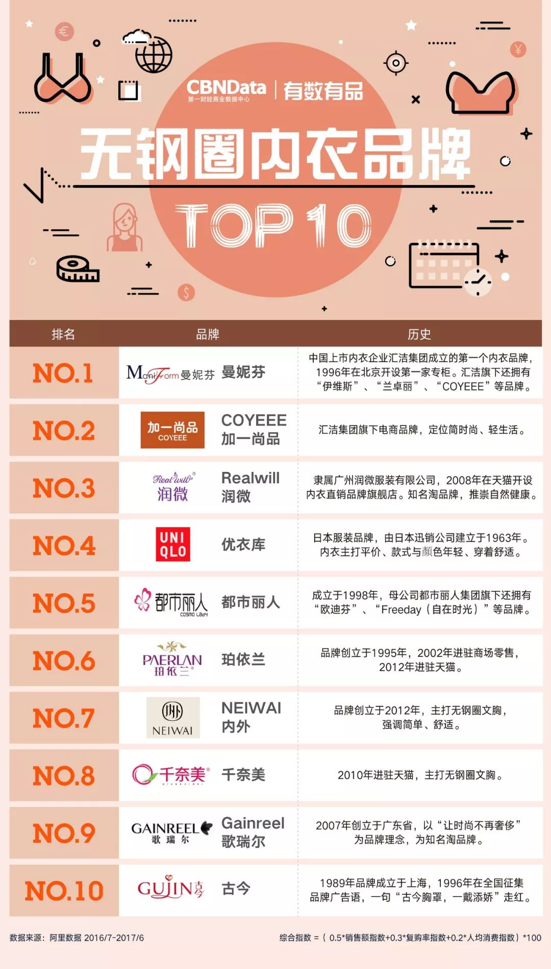 市场热点转变促使行业龙头企业纷纷发力电商。CBNData通过分析2016年7月至2017年6月的阿里巴巴消费数据,根据销售额、客单价、复购率三项综合指标评出线上内衣十大品牌。