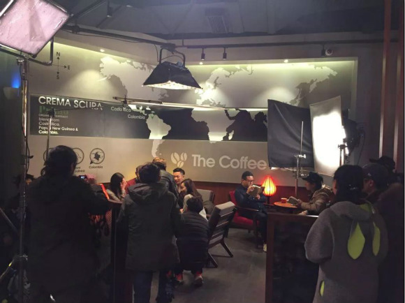 晚上9点半的太平洋咖啡店,灯光演员摄像已就位。