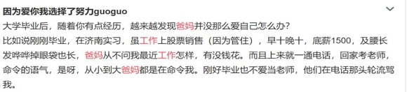 升职加薪也是长辈们在意的关键指标。不过对于家庭状况相对较好的这一代父母来说,所求的并非回报,而更多是希望子女的辛苦付出能有相应收获,能足以支撑其生活更好。“他们只要我不饿死就行”“他们看着房价上涨,也是担心我”“我爸觉得工作了几年就应该升升,不然没进步”“加班那么厉害给钱还不多的话绝对会上我妈黑名单的”……