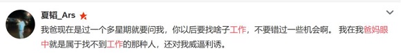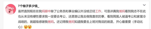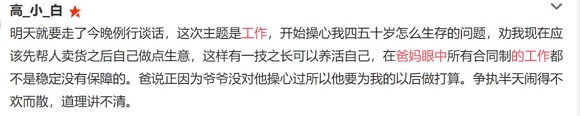 当所有人关心你飞得高不高时,父母也会在意你是否快乐,哪怕双方对快乐的定义不一样。“我爸妈不怎么和我聊工作,年轻人的行业他们也不太懂,只要我开心就好”“因为我去年加班太多身体不好,我妈都不催我找对象了,只关注我的身心健康问题。”