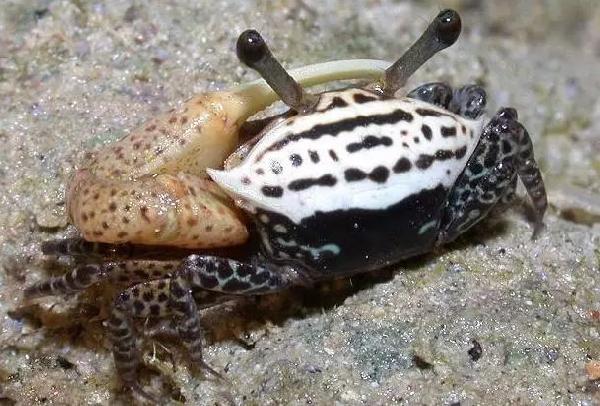 和尚蟹,全名短指和尚蟹,又名和尚蟹、兵蟹、海珍珠或北海沙蟹。生活在潮间带沙土的地道中,退潮时才出来活动。与普通螃蟹不一样的是,这种蟹可以向前走,挖沙方式像拧螺丝一样。而且雌雄蟹外表完全没有区别,食用时需要打开腹部才能区分,广西流行的沙蟹汁就是用和尚蟹做的。