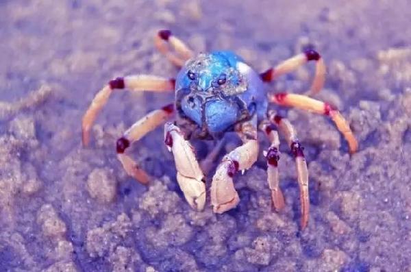 四角招潮蟹的头胸甲有蓝宝石般艳丽花纹。是中国台湾产的招潮蟹中,体色最美丽鲜艳的。天蓝色的背甲上镶缀着宝蓝的斑块,黄橙色的大螯掌节上有着红褐色星点,两指白色,不动指基部鲜红,步足则有紫褐色、紫红、橙色的变异。