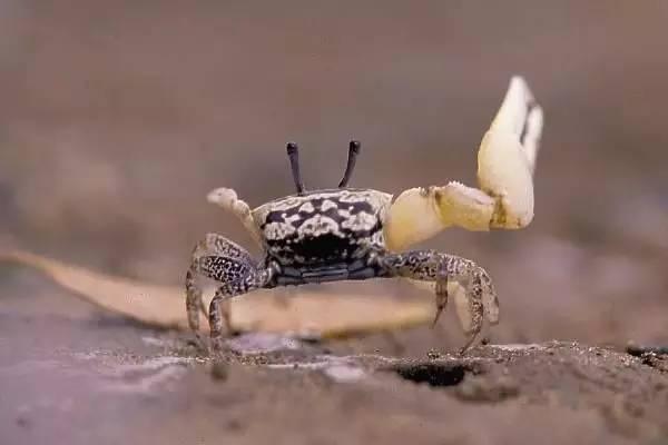 招潮蟹警觉性极高,在觅食时,两只眼睛高高竖起,观察周围动静。一旦发现情况,就会极速撤离。