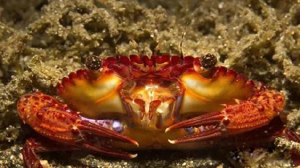 这就是憨态可掬的作揖蟹,色泽喜庆,时常双螯交叠,像极了迎宾的人,所以又称为迎宾蟹。