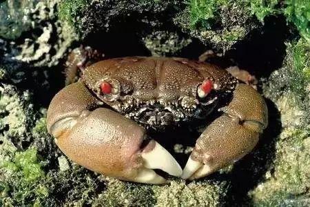 光手酋妇蟹因一对粗壮的螯脚表面光滑而得到「光手」这个名字,它是珊瑚礁潮间带的常见种,左右螯脚的钳指形态构造不同,右钳指通常较粗大,在可动指基部还长著像臼齿状的突出构造,是夹破贝壳的有力工具。那红色的眼睛,叫人看过都会忘不了。