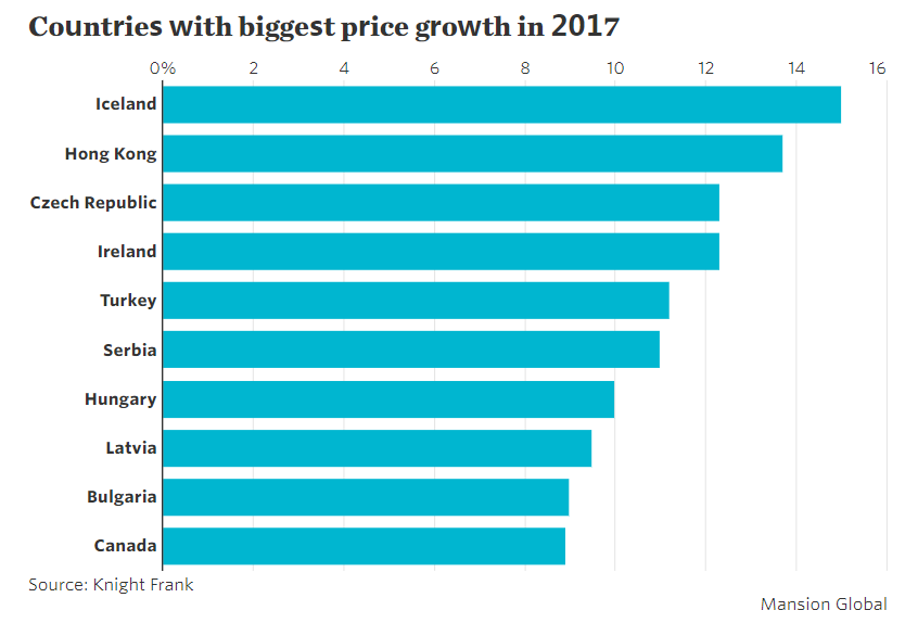 冰岛和中国香港去年的房价平均涨幅分别为15%和13.7%,在Knight Frank追踪的59个国家和地区中位居最前列。
