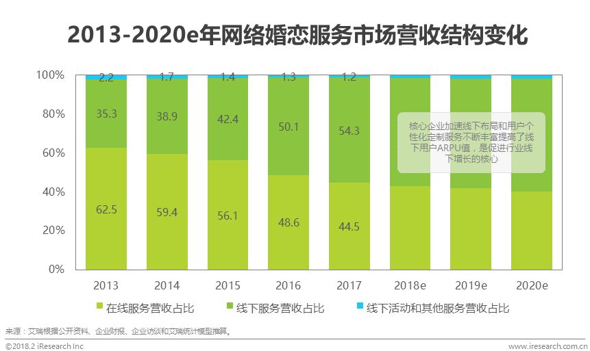 艾瑞根据公开资料整理,在网络婚恋服务市场营收结构占比中,在线服务营收占比2013年为62.5%,而到2017年在线服务营收占比为44.5%,降低18.0%,而线下服务营收占比由35.3%增加到54.3%,重要性不断提升。