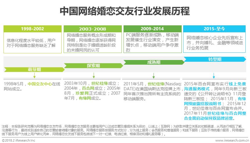 中国网络婚恋交友服务发展至今已然20年,在经历百家争鸣、巨头上市形成的稳定行业竞争格局后,2013年中国互联网移动端崛起为网络婚恋市场带来新的生机和机遇。随后2015年,网络婚恋尤其是移动端服务重回资本怀抱,投融资数量剧增,行业涌入重多新的竞争者,而核心企业包括百合网和有缘网也陆续开启上市征程,欲借资本力量继续巩固行业地位。2017年随着世纪佳缘与百合网的合并全面启动,双品牌运营战略落实,行业竞争格局将重归稳定。但同时核心企业不断拓展业务边界,从专一于婚恋服务向婚礼、金融等高潜力业务拓展,服务不断呈现多元化,市场覆盖范围剧增,行业正处于转型期。在网络婚恋核心企业品牌价值不断向规模庞大且高度分散的婚礼等产业链下游不断渗透的过程中,网络婚恋交友服务的市场价值或将被重新评估并同时获得新生。