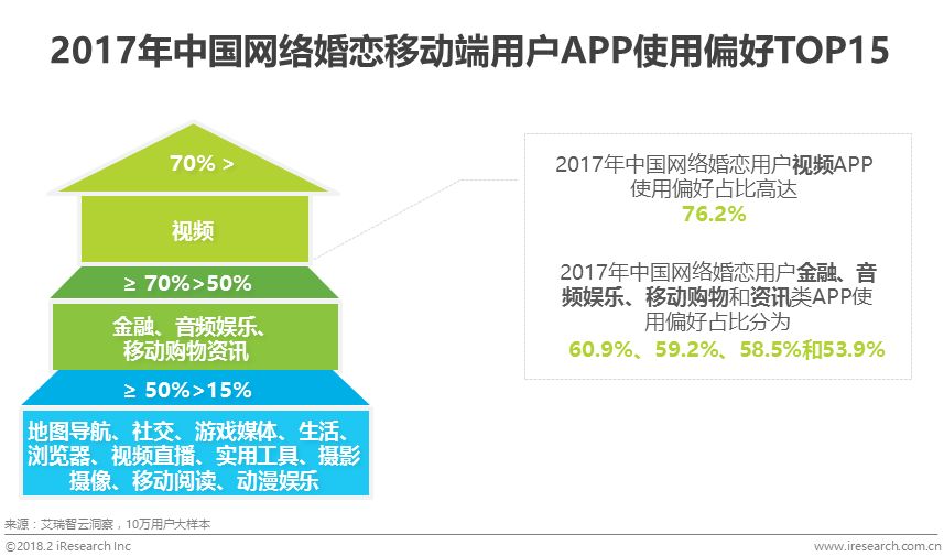 根据艾瑞智云洞察,中国网络婚恋移动端用户除使用婚恋APP外,最倾向于使用视频APP,用户占比高达76.2%,其次是金融60.9%,再次是音频娱乐59.2%。从整体使用情况分析,中国网络婚恋移动端用户APP使用偏好分为三个梯队,视频类位于第一梯队优势领先,第二梯队依次为金融、音频娱乐、移动购物和资讯,而地图导航、社交和游戏媒体等则位于第三梯队。