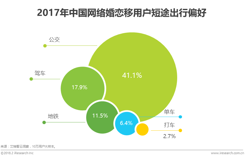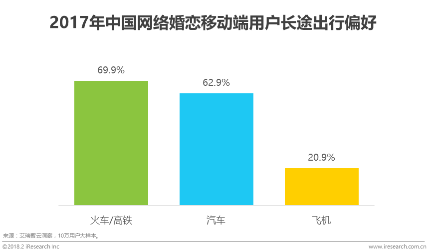 根据艾瑞智云洞察,中国网络婚恋移动端用户短途出行最倾向于选择公交出行,用户占比高达41.1%,其次是驾车17.9%,而选择地铁、单车和打车短途出行的用户占比则分别为11.5%、6.4%和2.7%。此外,在长途出行时,网络婚恋移动端用户的选择分别为火车/高铁69.9%、汽车62.9%和飞机20.9%。