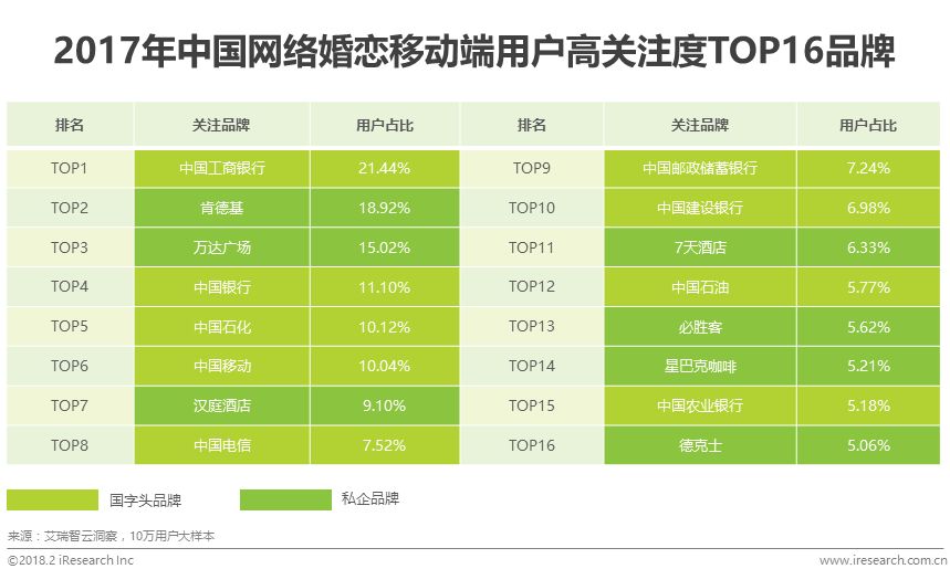根据艾瑞智云洞察,在中国网络婚恋移动端用户关注的TOP品牌中,国字头品牌由于垄断了覆盖群众基础生活的诸多方面的服务,无可争议的成为用户高关注度品牌,例如中国工商银行、中国银行、中国石化和中国移动等。相比较之下,肯德基、万达广场和汉庭酒店等排名位于前列的私企品牌,对于网络婚恋核心企业可谓为具有更高探索价值的合作伙伴。