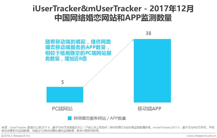 移动端:2017年网络婚恋交友服务移动端月独立设备数整体增长趋稳,在2017年9月达到峰值2045万台,年度月均独立设备数为1856万台。未来随着移动端服务的不断丰富,月独立设备数将进一步增长。