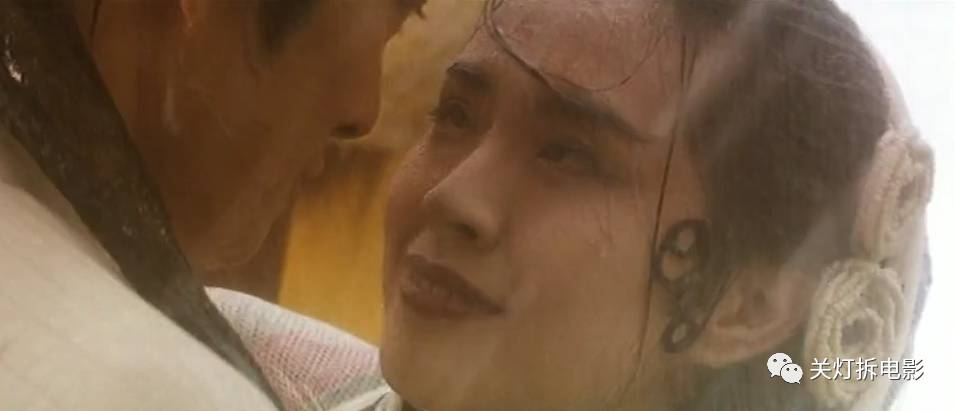 西湖初遇,白蛇长发被雨打湿,一缕青丝熨帖在胸前,水珠顺着发丝轻轻滑落。