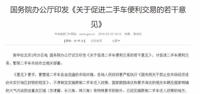 但长久以来,国内二手车市场的车源流通并不乐观,因为受限于排放政策等因素,国内多地方针对二手车设置有限迁政策。简单来说,如果在异地购买的二手车不符合当地的排放政策等约束条件,就不能上户。为促进二手车市场的流通,2016年3月国务院发布《关于促进二手车便利交易的若干意见》,力图打破各地方针对二手车限迁政策的桎梏。中国汽车流通协会的数据显示,2016年二手车供给量成为拉动二手车市场增长的重要关键因素应与此政策有一定关联。可事实上,自政策发布后,各地方的限迁政策依旧存在,同时还有其他除排放政策外的补充约束条款。
